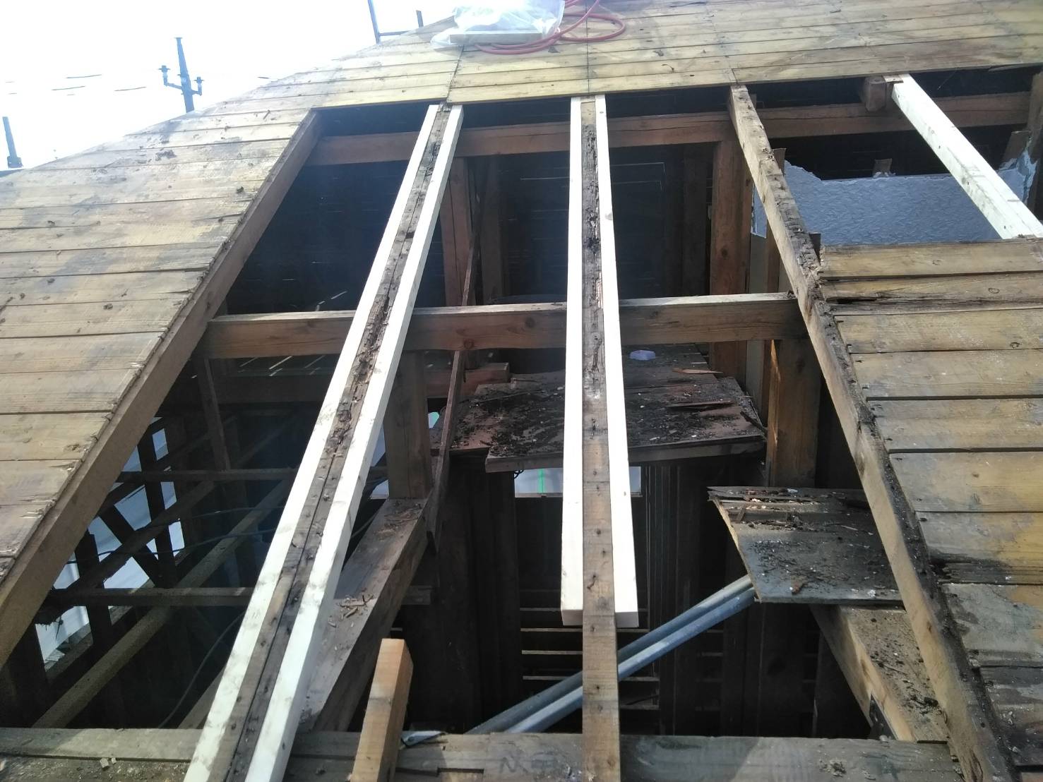 5番の写真のトップライトの左下の垂木部分が黒ずんでいるところが以前からの漏水部分です。