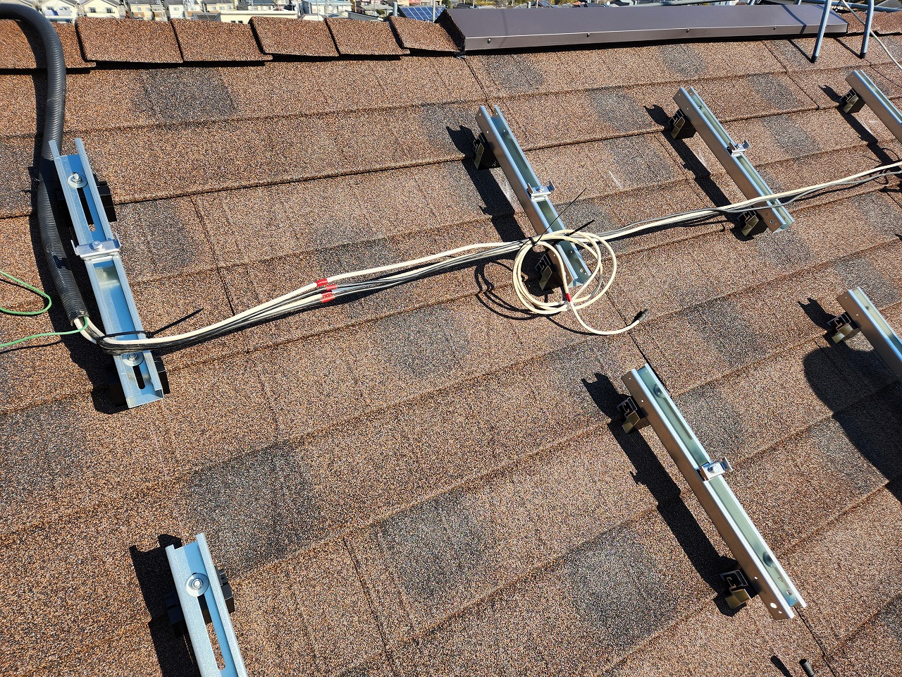 太陽光パネルが乗っかっている屋根に支障があり、カバー工法にて太陽光パネルの架台を屋根に穴を開けずに固定する工法をチョイスします。